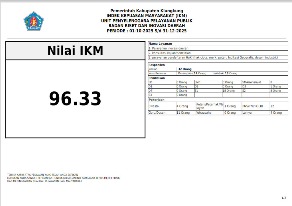 Nilai Indek Kepuasan Masyarakat (IKM) pada Tri Wulan IV, Badan Riset dan Inovasi Daerah Kabupaten Klungkung 12/01/2026 oleh Editor